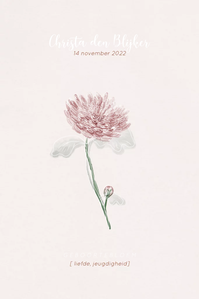 Mooie poster voor de babykamer met de geboortebloem van november: de chrysant en haar betekenis: liefde en jeugdigheid. Pas de poster naar wens aan. Leuk als cadeautje voor de geboorte.