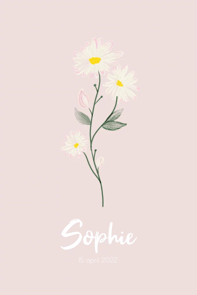 Poster voor de babykamer met de geboortebloem van april; een madeliefje.