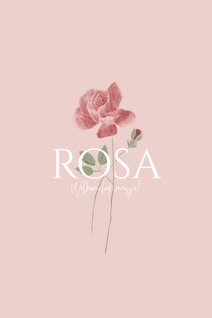 Roze poster met een roos; de geboortebloem van juni. Pas de bloem aan naar de geboortebloem van jouw kindje!