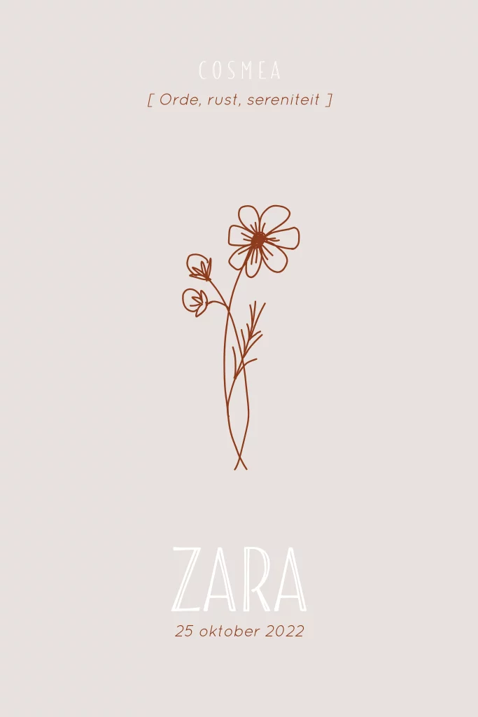 Geboorteposter met de geboortebloem van oktober: de cosmea. Geef deze geboorteposter cadeau aan een vriendin of hang hem in jullie eigen babykamer!