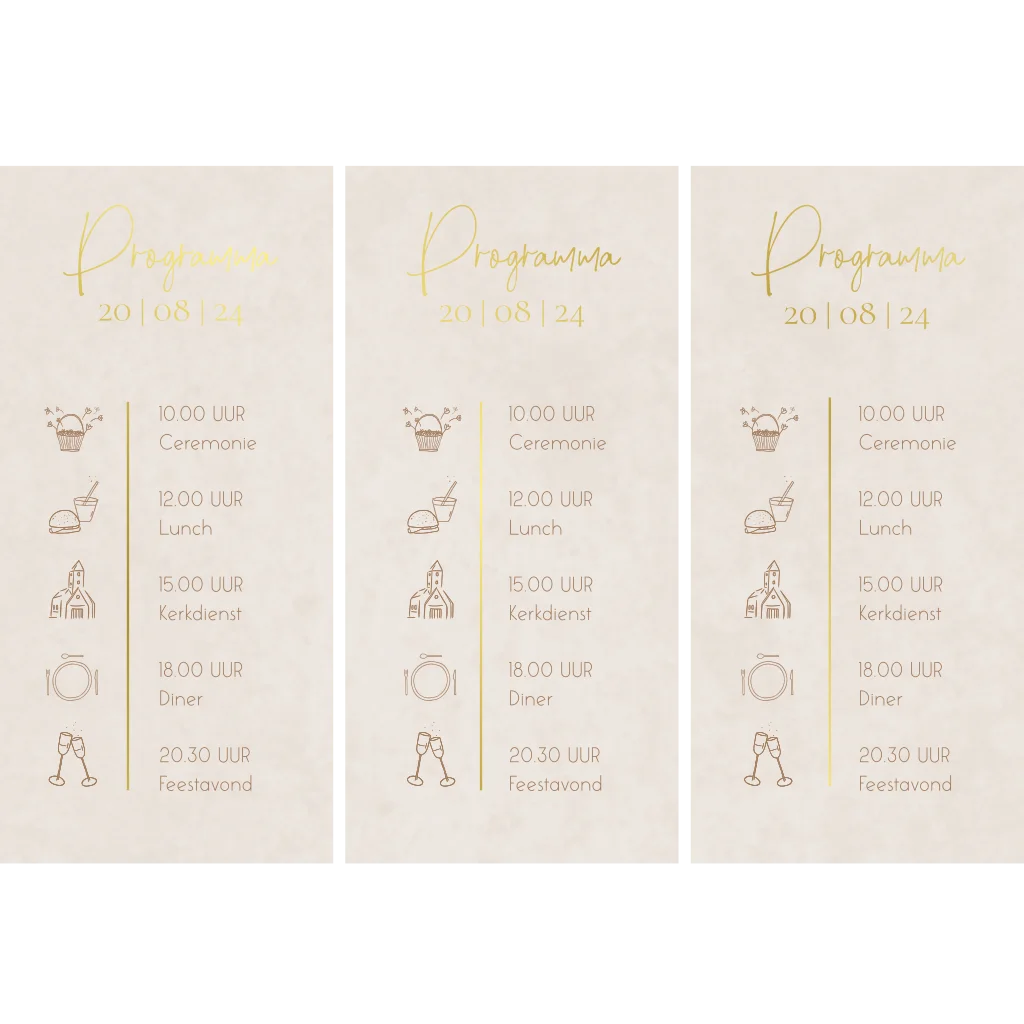 Drie dagprogramma kaartjes met een chique velvetlook achtergrond in de kleur beige. Je kunt deze kaarten helemaal naar wens aanpassen in de online editor en programma items toevoegen.
