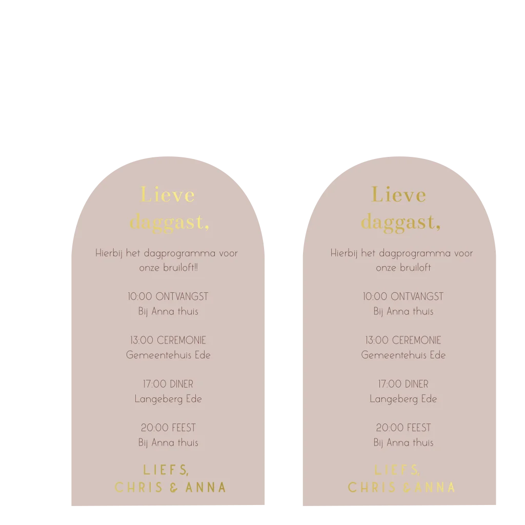 Twee dagplanningen met een halve boog en goudfolie. Pas de informatie op de dagplanning naar wens aan in de online editor.