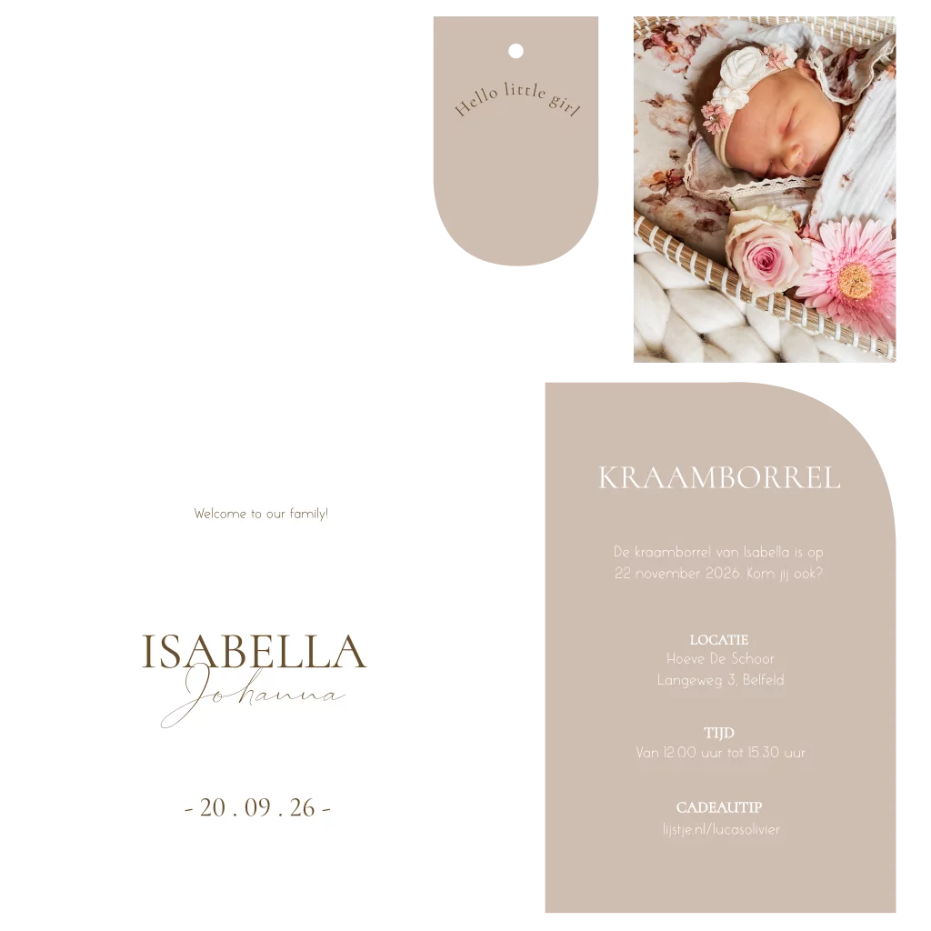 Chique geboortekaart set voor een meisje met een foto, kraamborrel kaartje en een lakzegel. De lakzegel zit er niet automatisch bij, deze kan je vinden onder 'extra's'. Daarnaast een tip: bij studioknottie.nl kan je de mooiste lakzegels laten maken in een kleur die jij mooi vindt!