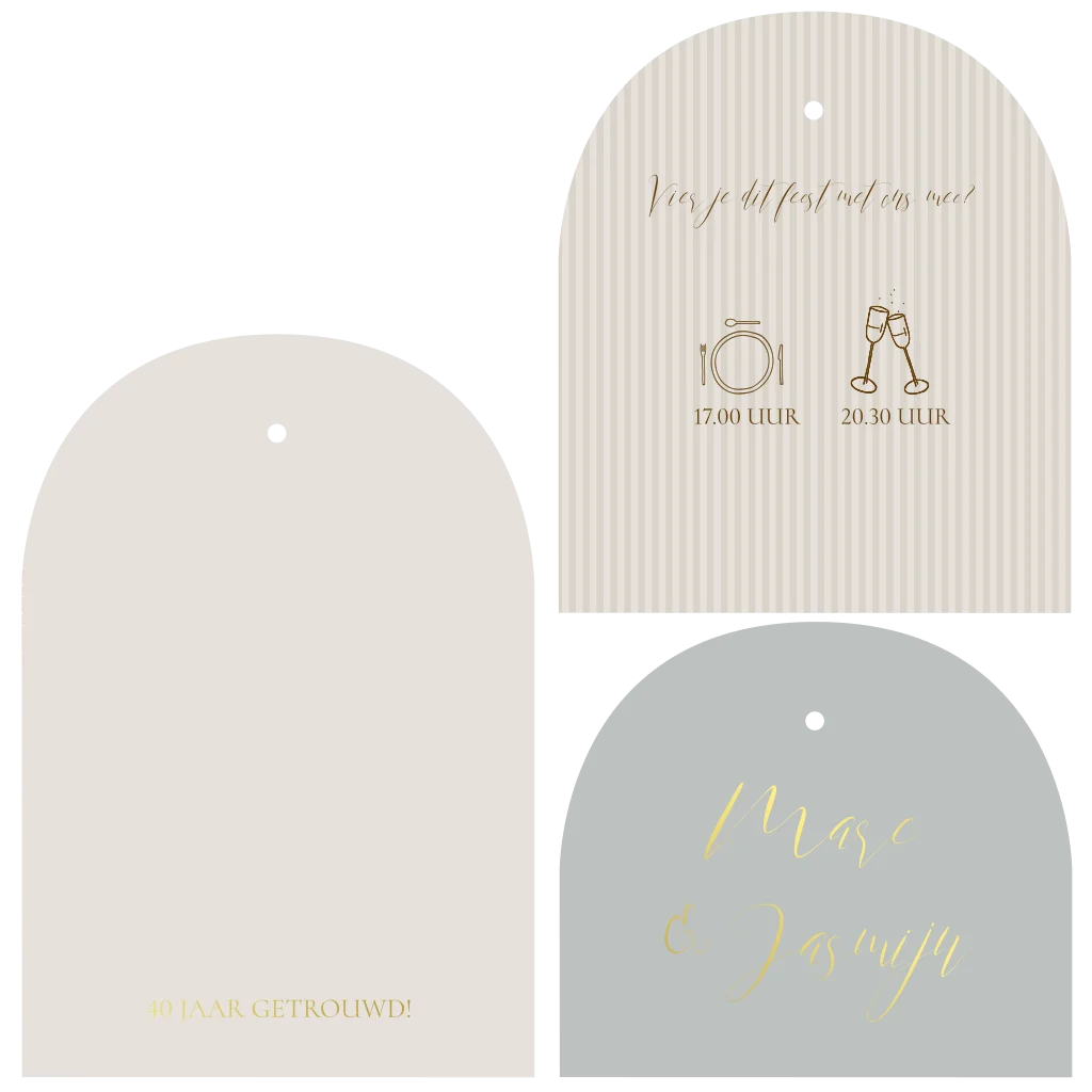 Chique jubileumkaart set met boogvorm kaarten. Je kunt deze drie boogvorm kaartjes aan elkaar bevestigen met mooi lint of met een splitpen.