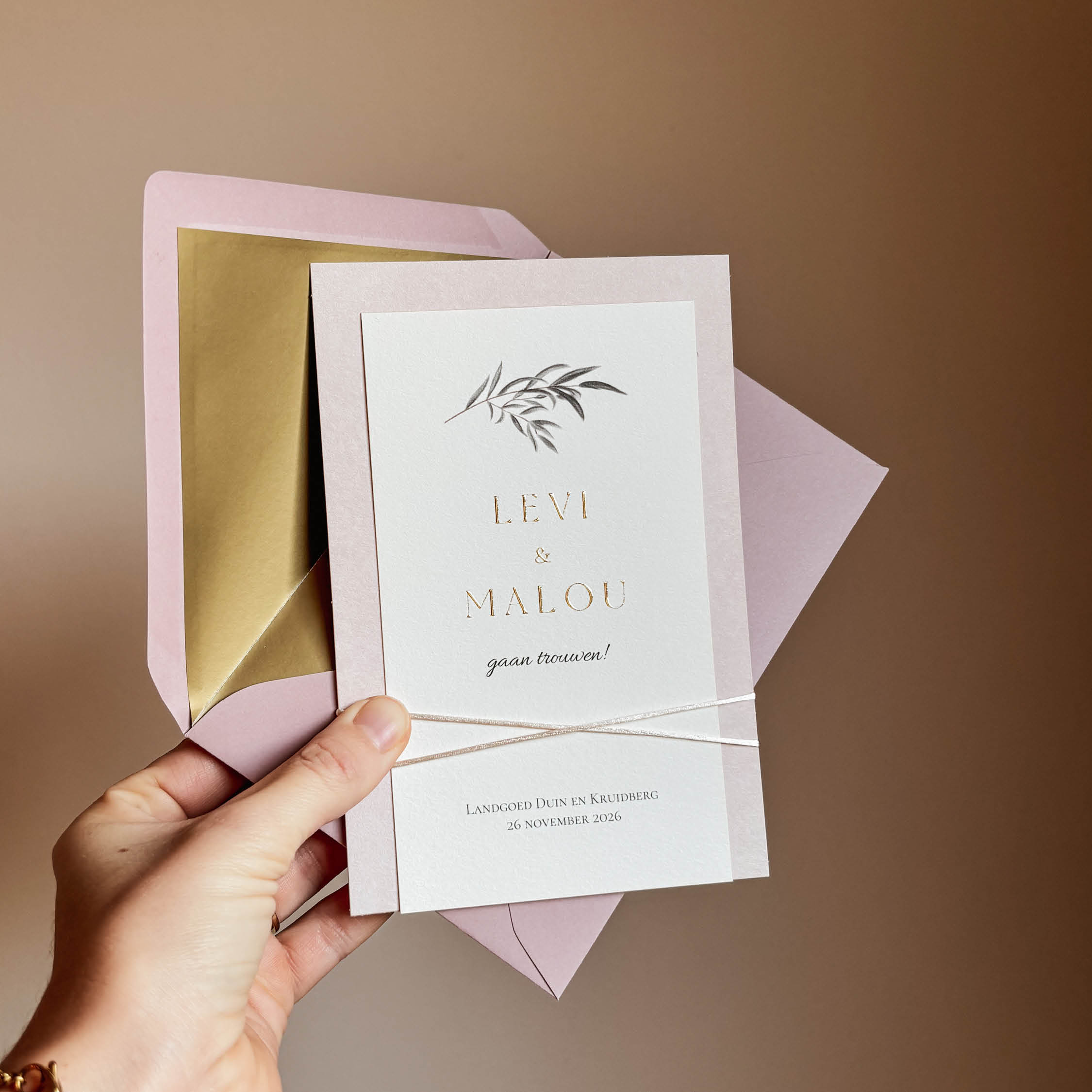 Lichtroze met olijftakjes vind ik een prachtige combinatie! Deze kaart is voorzien van een dagplanning en een beige voorkaartje. Deze kunnen worden samengebonden met een mooi lint of met een paperclip. Beiden zijn ook via de shop te verkrijgen!