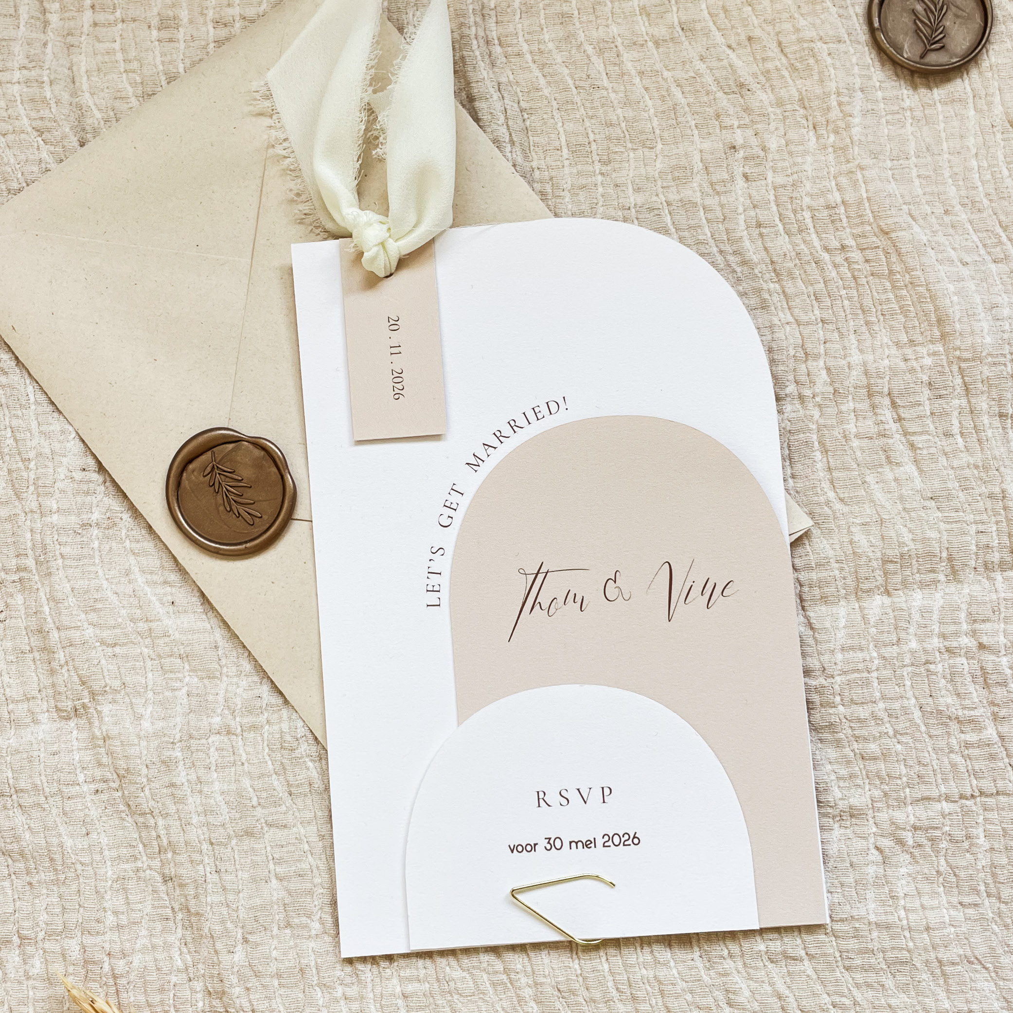 Prachtige chique trouwkaart set met zandkleur