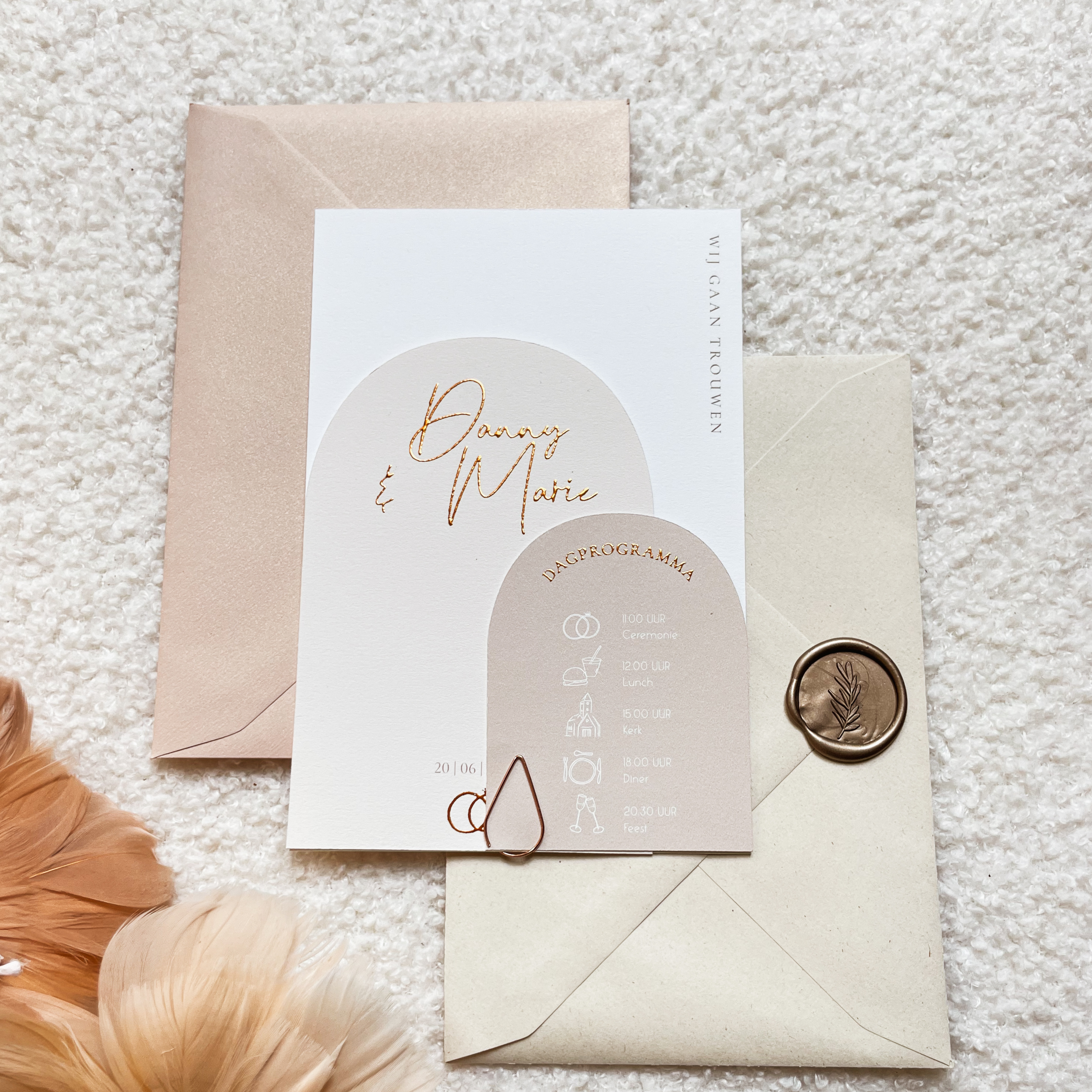 Prachtige trouwkaart set met boogvorm kaartjes en folie. Pas deze kaart naar wens aan in de online editor! Let op: De kaart wordt geleverd zonder paperclip. Je kunt de paperclip zoals op de foto bijbestellen via de volgende link: https://lindesigned.nl/paperclips