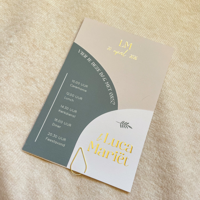 Trouwkaart set in aardetinten: donkergroen, zandkleur en beige. Je kunt de kaart helemaal naar wens aanpassen in de online editor en daar ook de kleuren veranderen. Leuk om op de achterkant van 1 van de boogvorm kaartjes een foto te plaatsen, of nog wat extra informatie voor de trouwdag. Let op: De kaart wordt geleverd zonder de paperclip. Je kunt de paperclip zoals op de foto bijbestellen via de volgende link: https://lindesigned.nl/paperclips