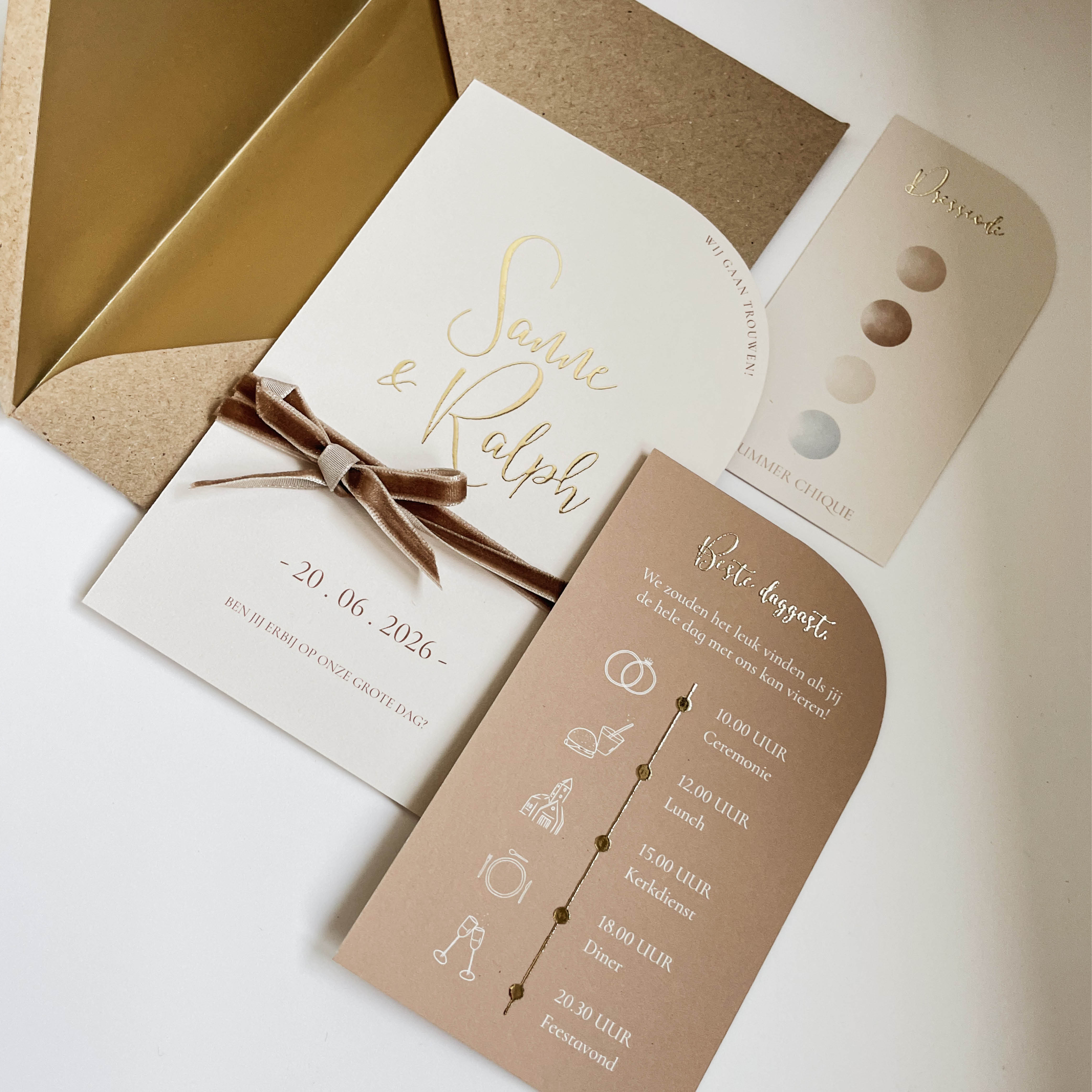 Chique trouwkaart set in natuurlijke kleuren en met bijzondere vormen. De kaarten zijn gemaakt in een halve boogvorm en kunnen helemaal naar wens worden aangepast. Let op: De kaart wordt geleverd zonder lint. Je kunt het lint: Fluweel lint taupe zoals op de foto bijbestellen via de volgende link: https://lindesigned.nl/touwtjes