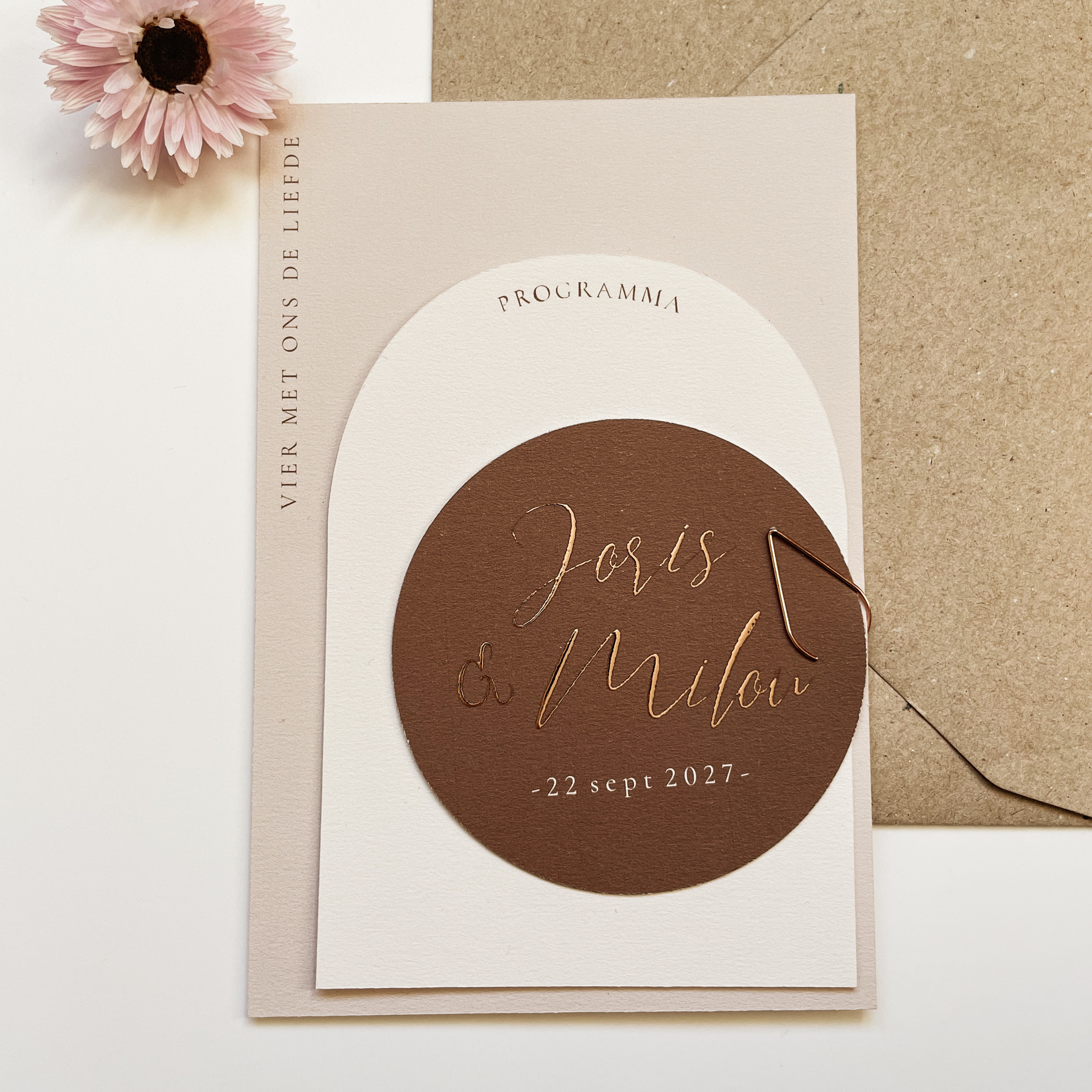 Unieke en chique trouwkaartenset in natuurlijke kleuren. Oudroze, lichtroze en bruin zijn de hoofdtinten in deze kaart; voorzien van prachtige roségouden foliedruk. Een prachtig kaartje voor een bruiloft in natuurlijke tinten. Let op: De kaart wordt geleverd zonder paperclip. Je kunt de paperclip zoals op de foto bijbestellen via de volgende link: https://lindesigned.nl/paperclips