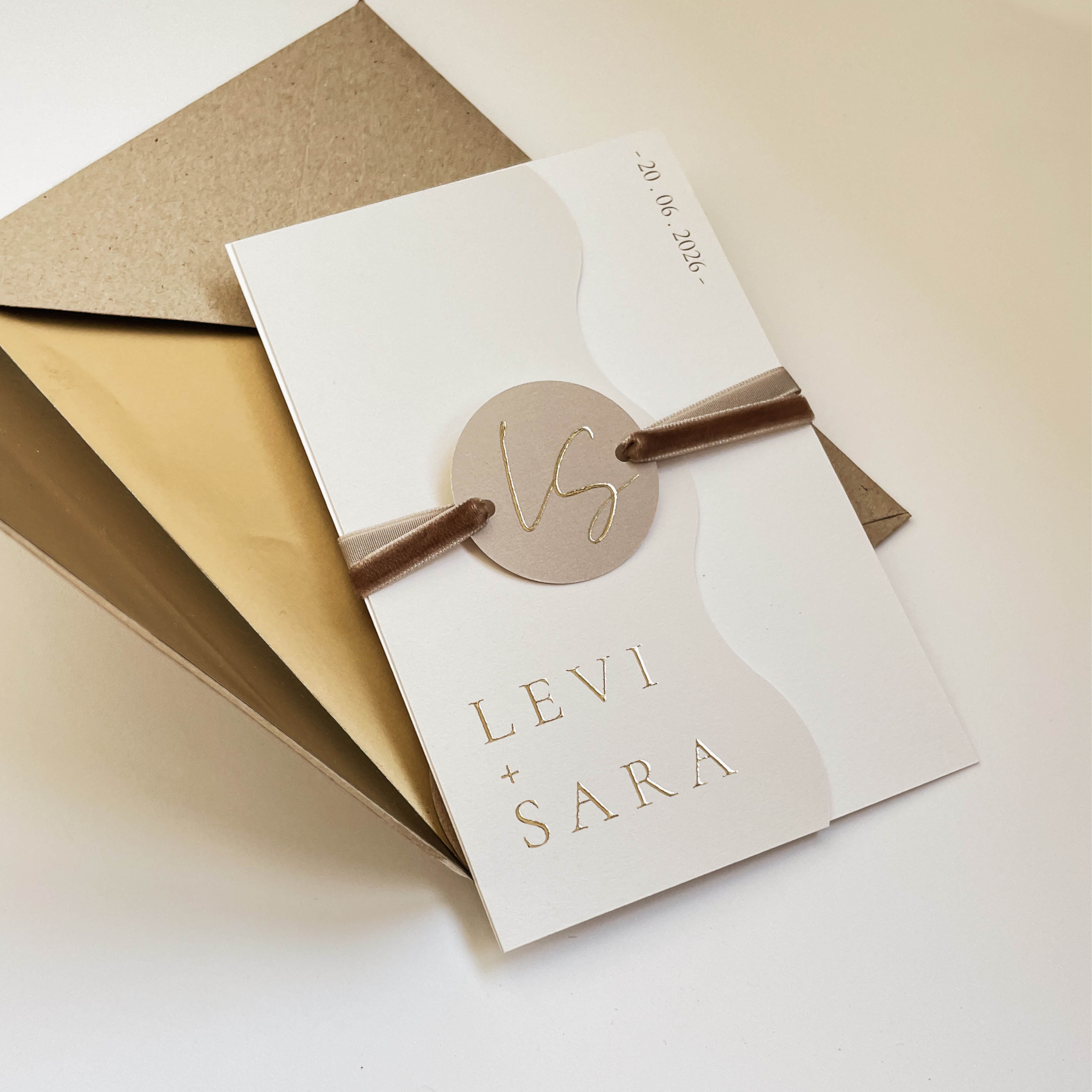 Mooie trouwkaarten set met golven en goudfolie. De trouwkaart is gemaakt in zandkleur, beige, natuurlijke tinten maar je kan de kleur natuurlijk gewoon aanpassen! Hulp nodig? Stuur dan even een mailtje! Let op: De kaart wordt geleverd zonder lint. Je kunt het lint: fluweel lint taupe zoals op de foto bijbestellen via de volgende link: https://lindesigned.nl/touwtjes