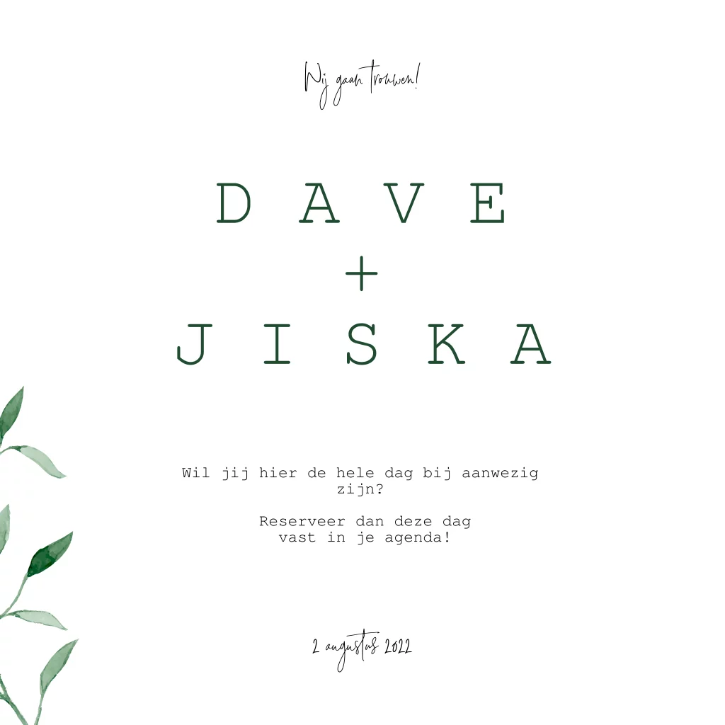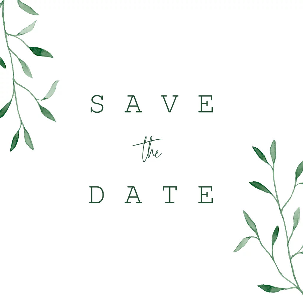 Vierkante botanische save the date met groene takjes. Het kaartje is helemaal naar wens aan te passen. Voeg bijvoorbeeld een achtergrondkleur toe of ga voor een ander lettertype.
