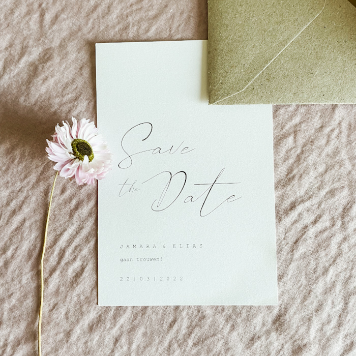 Wil je je gasten een stijlvolle en minimalistische 'save the date' sturen? Kies dan voor deze chique kaart met sierlijke tekst en een licht beige achtergrond. De kaart is eenvoudig, maar stijlvol en past perfect bij een klassieke of moderne bruiloft. De kaart is ook verkrijgbaar in zwart-wit en met zilver- of zwartfolie.