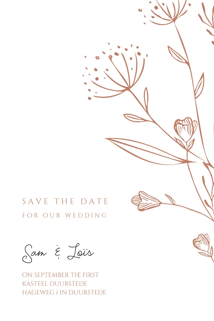 Save the date met handgetekende bloemen in roestkleur. De save the date is minimalistisch, maar wordt door de bloemen toch lekker speels.