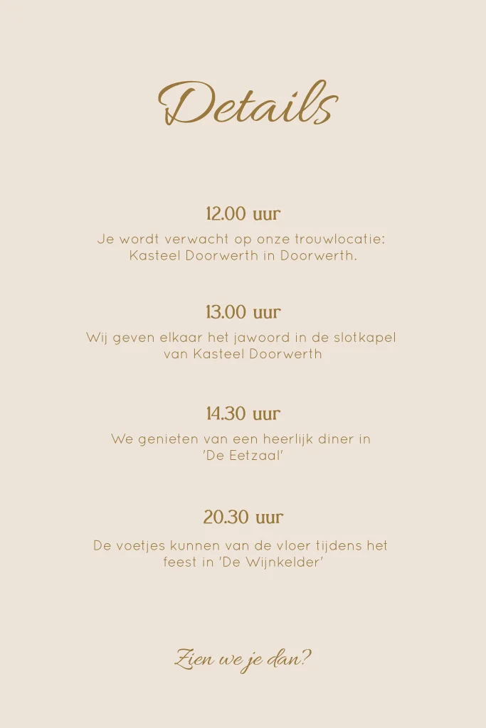 Kaartje met details over de trouwdag, passend bij de trouwhuisstijl Soft Classic. Pas deze kaart aan zodat hij perfect past bij jullie trouwkaart!