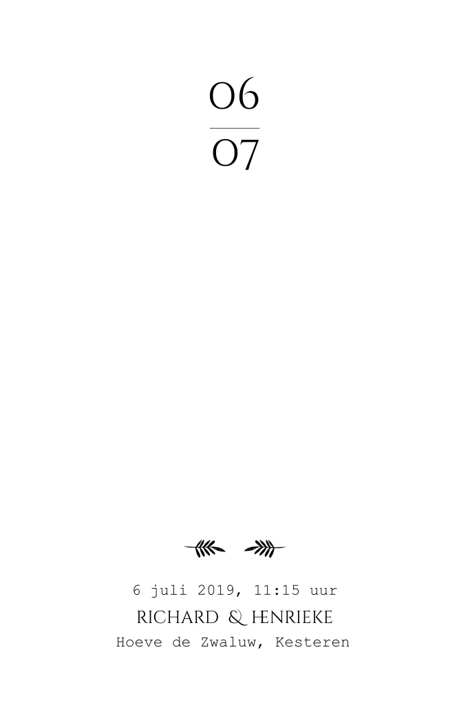 Minimalistisch zwart wit trouwkaartje met takjes. Er zijn bijpassende bandjes bij dit kaartje, waarmee je bijvoorbeeld een bloemetje op de voorkant kunt bevestigen.