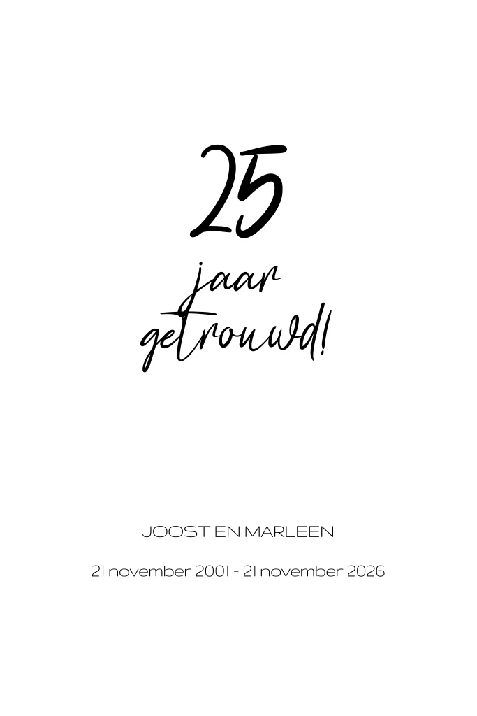 Minimalistisch jubileumkaartje met zwarte tekst en een witte achtergrond. Het perfecte jubileumkaartje voor een minimalistische jubileumdag!