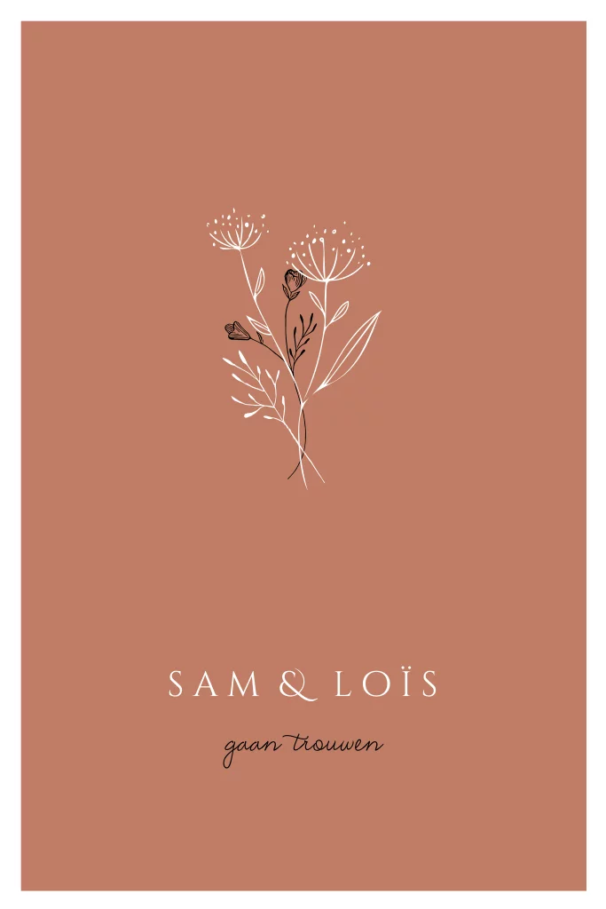 Mooi trouwkaartje met een roestkleur achtergrond en een bosje bloemen. Liever goudfolie in plaats van zwart met witte tekst? Pas het gemakkelijk aan in de editor!