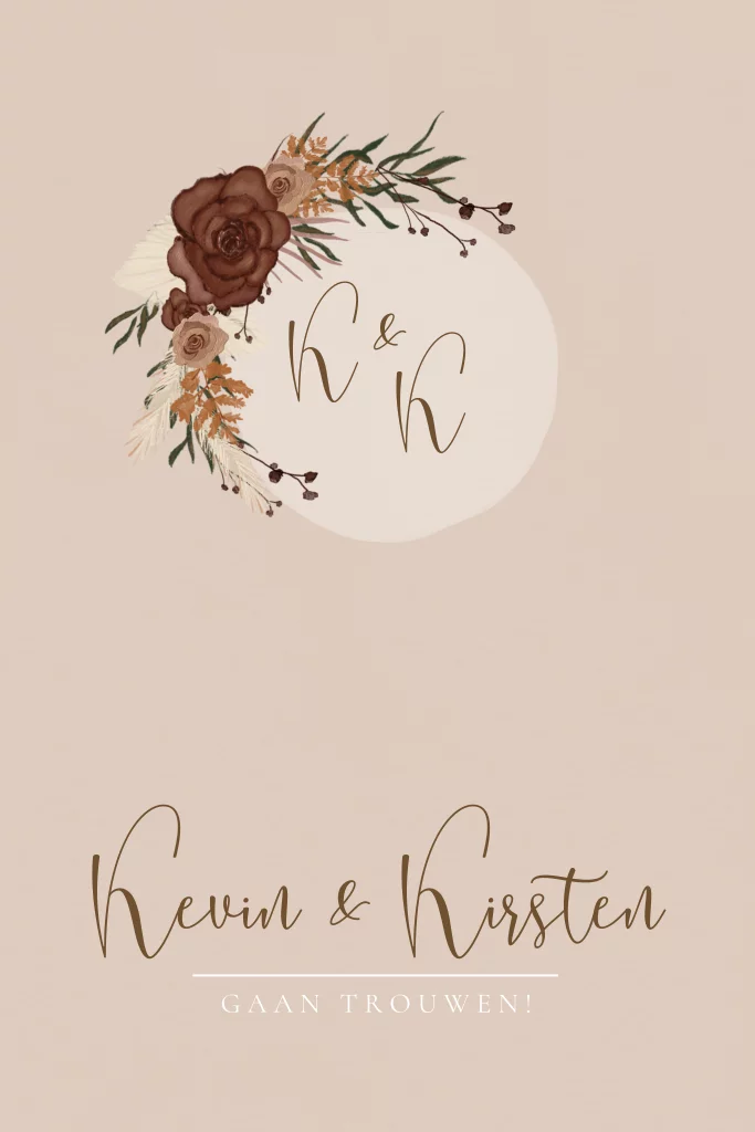 Mooie landelijke chique trouwkaart met roestkleur tekst, witte cirkel en handgeschilderde bloemen.