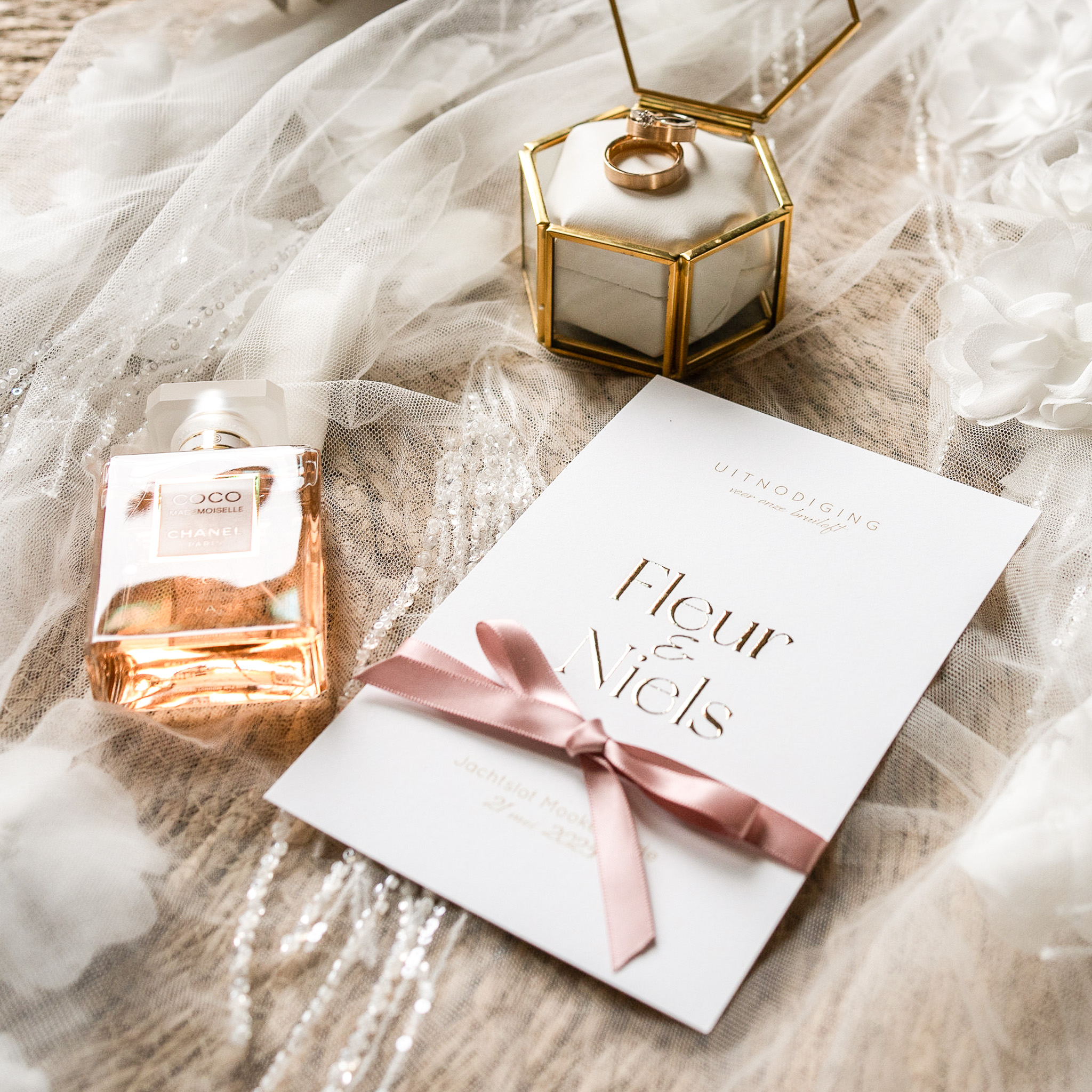 Een prachtige trouwkaart met een witte achtergrond en goudfolie initialen. De kaart is helemaal naar wens aan te passen in de online editor! Perfect voor een minimalistische bruiloft met trendkleuren wit en goud.
