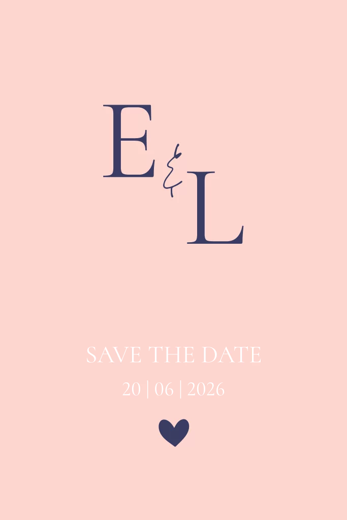 Unieke Save the Date met lichtroze achtergrond en blauwe tekst. Je kunt het ontwerp helemaal naar wens aanpassen. Bijpassend bij de trouwhuisstijl Peachy Blues.